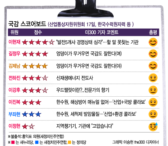 [편집자주] '국감 스코어보드'는 자료충실도·현장활약·국감매너·정책대안 등 4가지 잣대를 바탕으로 머니투데이 the300 기자가 바라본 국회의원들의 활동을 보여드립니다. 매일매일 주요 국정감사 현장을 촌철살인 코멘트와 친근한 이모티콘으로 전달해줌으로써 국민들에게 정치가 보다 가까이 다가가고, 국감이 내실을 기할수 있도록 하기 위한 것입니다.