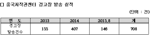 18일 국회 교육문화체육관광위원회 신성범 새누리당 의원이 저작권위원회로부터 제출받아 공개한 '중국 저작권센터 불법 저작물 단속 결과'에 따르면 2013년 155건이던 중국내 불법 저작물 건수는 지난해 407건으로 급증했다. 2015년도에도 8월 기준 146건이 적발됐다.
