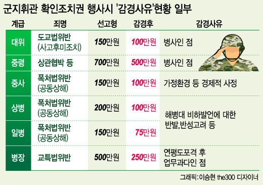 사례를 보면 지난 2012년 중령이 상관협박 등을 이유로 기소된 사건에서 영관급 장교인 중령에 대해 '병사(兵士)인 점'이라는 엉뚱한 사유가 붙어 벌금 700만원에서 500만원으로 감경되기도 했고, 위관장교인 대위에게도 상해사건과 뺑소니로 인한 도로교통법 위반건도 '병사인 점'이라는 엉터리 사유를 붙여 감경시켰다.