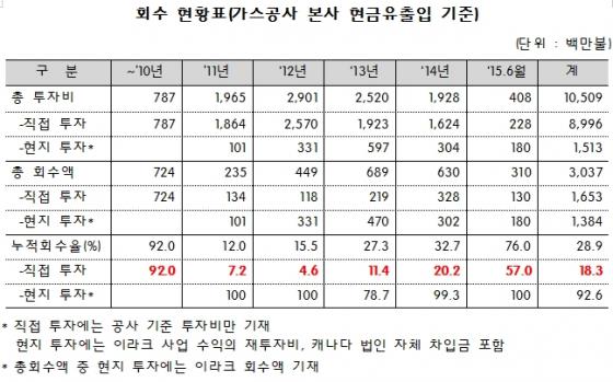 21일 국회 산업통상자원위원회 전하진 새누리당 의원이 가스공사로부터 제출받은 자료에 따르면 가스공사의 1996년부터 올해 6월 말까지 누적 투자액은 89억9600만달러(약 10조5500억원)에 이르고 있으나, 회수액은 16억5400만달러(약 1조9400억원)에 불과해 회수율은 18.3%로 집계됐다.