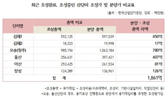 21일 국회 산업통상자원위원회 소속 김제남 정의당 의원이 한국산업단지공단(산단공)으로부터 제출받은 자료에 따르면, 산단공은 최근 김해(1,2), 아산, 잔성 산업단지 분양 수익으로 각각 467억원, 81억원, 126억원을 벌어들였다. 용지보상이 진행 중인 오송과 울산산단은 각각 780억원, 407억원으로 집계됐다.