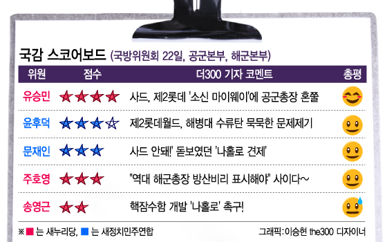 [편집자주] '국감 스코어보드'는 자료충실도·현장활약·국감매너·정책대안 등 4가지 잣대를 바탕으로 머니투데이 the300 기자가 바라본 국회의원들의 활동을 보여드립니다. 매일매일 주요 국정감사 현장을 촌철살인 코멘트와 친근한 이모티콘으로 전달해줌으로써 국민들에게 정치가 보다 가까이 다가가고, 국감이 내실을 기할수 있도록 하기 위한 것입니다.