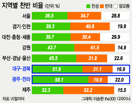서울(36.5%), 경기·인천(39.3%), 대전·충청·세종(39.7%), 제주(32.3%)지역은 찬성비율이 30%대에 머물렀으며 강원은 43.7%, 부산·경남·울산은 45.5%가 찬성한다고 밝혔다.