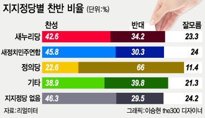 정의당 지지자의 경우 찬성 22.6%, 반대 66%, '잘 모르겠다'는 의견 11.4%로 반대 의견이 3배나 많았다.