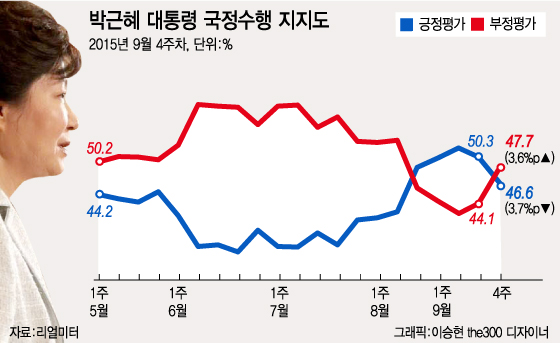 여론조사 전문기관 리얼미터(대표 이택수)가 25일 발표한 9월 4주차 주간집계(21~24일)에 따르면 박 대통령 지지율은 전 주 대비 3.7%포인트(p) 하락한 46.6%를 기록, 2주 연속 하락세를 보였다. '국정수행을 잘못하고 있다'는 부정평가는 전 주보다 3.6%p 오른 47.7%로 긍정-부정평가 간 격차는 6.2%p에서 -1.1%p로, 부정평가가 다시 긍정평가를 앞섰다.