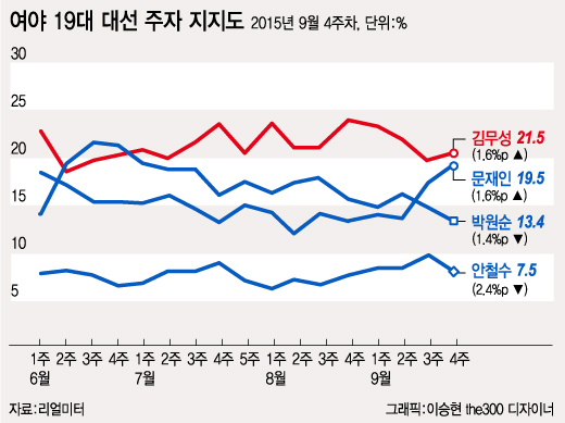 문재인 새정치연합 대표는 1.6%p 상승한 19.5%로 2주 연속 상승하며 김무성 대표와 오차범위 내인 2.0%p 차를 유지하며 2위를 이어갔다.