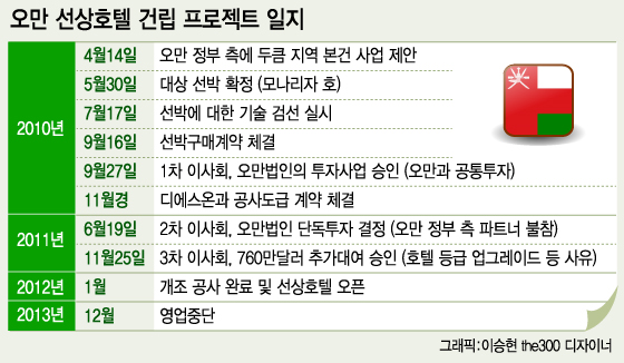 최근 3조원대 영업 손실로 논란이 됐던 대우조선해양이 지난 2010년 중동 오만에서 선상호텔 건설프로젝트를 추진하면서 이사회 승인도 받지 않고 수백억원 규모의 구매계약을 체결했던 것으로 내부 감사 결과 확인됐다. 또 해당 프로젝트가 추진되는 과정에서 투자결정을 위한 핵심 정보들이 이사회에 허위로 보고되거나 실제로 시공하지도 않은 공사비가 청구, 지급되는 등 내부 통제가 사실상 와해됐던 것으로 나타났다.