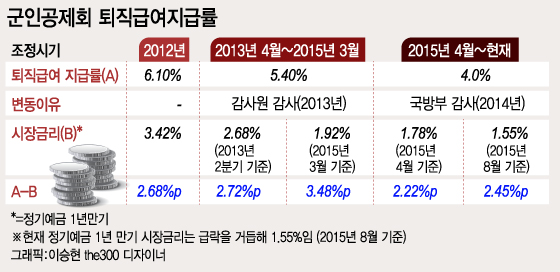 군인공제회는 2014년 국방부 자체 감사 이후 또 한 차례 퇴직급여지급률을 4%로 인하했지만 계속되는 시장금리 하락으로 지급률과 시장금리의 차이가 확대될 전망이다.