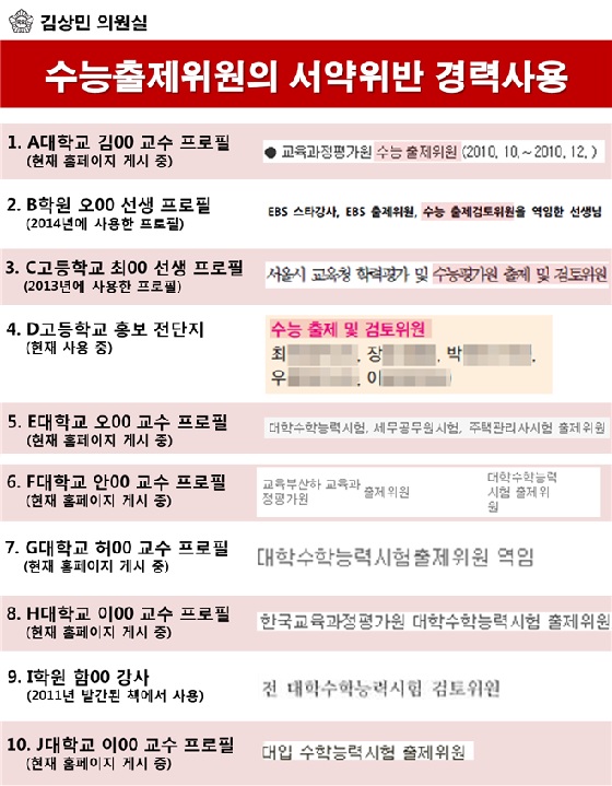 국회 정무위원회 소속 새누리당 김상민 의원은 5일 수능 출제·검토위원들은 출제본부 입소 전 '출제·검토위원 참여사실 비밀준수' 항목이 포함된 서약서를 작성케 돼 있지만 자체조사 결과 10건 이상의 위반을 발견했다고 밝혔다.
