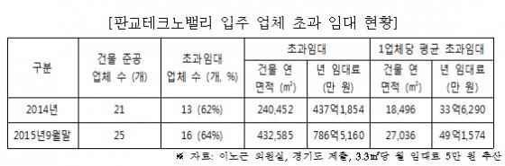 국회 국토교통위원회 소속 이노근 새누리당 의원이 5일 경기도로부터 제출받아 공개한 자료에 따르면 지난해 기준 판교테트노밸리에 입주한 21개 업체 중 13개 업체가 계약서와 달리 초과 임대해 437억1854만원의 임대수입을 올린 것으로 보인다.
