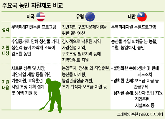 현재 미국은 농업분야 무역조정지원제도(TAAF·Trade Adjustment Assistance for Farmers)는 시장개방으로 소득이 감소한 농어민을 대상으로 △새로운 상품개발 △신규시장 개척 △대안적 기술 및 재취업 직업훈련 등의 프로그램을 제공하며 시장개방에 따라 농어민들의 경쟁력을 향상하도록 하는데 집중하고 있다.