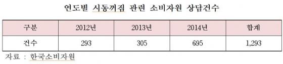 자동차 시동꺼짐으로 인한 소비자원 상담건수를 보면 △2012년 293건 △2013년 305건 △2014년 695건 등으로 총 1293건이 접수됐다.