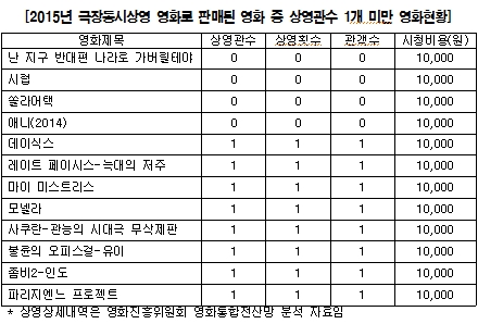 박 의원에 따르면 극장동시상영작 기준에 미달된 51건 중 8건은 단 1개 상영관에서 개봉한 영화였고, 이들 영화의 누적 관객수는 1명에 그쳤다. 심지어 극장에 걸린 적도 없는 '난 지구 반대편 나라로 가버릴테야' '솔라어택' 등 4건의 영화를 극장동시상영으로 둔갑시켰다.