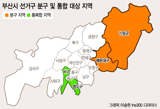 부산은 거물들간의 지역구가 통폐합 대상이다. 정의화 국회의장의 지역구인 중구동구와 김무성 새누리당 대표의 지역구인 영도구, 유기준 해양수산부 장관의 지역구인 서구가 통폐합 대상으로 최소 한석은 줄 수 밖에 없는 상황이다. 배덕광 새누리당 의원의 지역구인 해운대기장군갑이 분구 대상이라 전체적으로 부산 의석수는 변화가 없을 것으로 보인다.