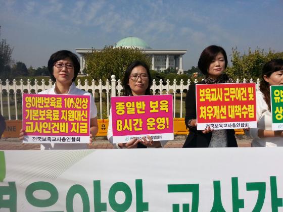 한국민간어린이집연합회와 전국보육교사총연합회, 참사랑보육학부모모임은 15일 국회 앞에서 합동 기자회견을 열고 △누리과정 보육료 30만원 지원약속 이행 △종일반 보육 8시간제로 전환 및 초과보육비 정부지원 △보육교사 근무여건 및 처우개선 대책 수립 등 '6대 핵심 요구사항'을 촉구했다.