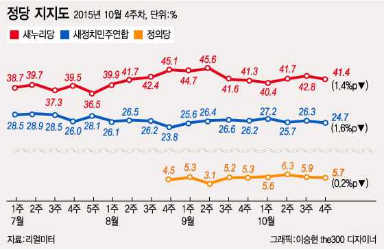 새정치연합의 지지율은 주초 안철수 전 공동대표와 문재인 대표의 혁신 공방으로, 역사교과서 국정화 반대 대여 전선이 분열되고 지지층이 이탈하면서 하락했으나, 주 중후반에는 여야 5자 청와대 회담을 계기로 역사교과서 국정화 반대여론을 결집시키며 상승했다.