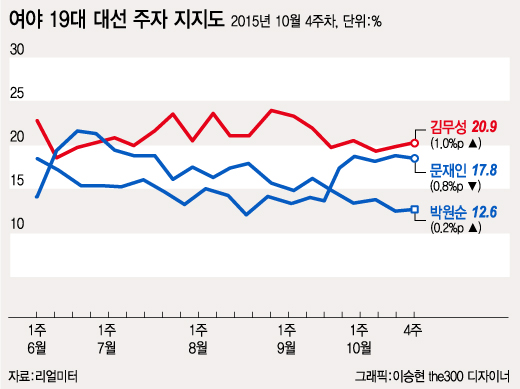새정치연합의 역사교과서 국정화 반대 대여 공세에 보조를 맞춘 박원순 서울시장은 0.2%p 반등한 12.6%를 기록, 문재인 대표와의 격차를 5.2%p로 좁히며 3위를 유지했다. 당 혁신을 둘러싸고 문재인 대표와 대립했던 안철수 전 공동대표는 7.5%로 0.3%p 하락했지만 4위를 지켰고, 오세훈 전 시장은 0.6%p 상승한 6.9%로 5위, 유승민 전 원내대표는 0.7%p 오른 4.5%로 한 계단 상승한 6위를 기록했다.