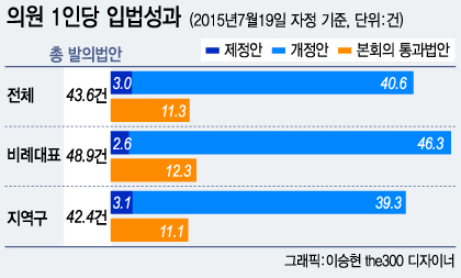 국회의원 1인당 입법성과를 살펴보면 비례대표 의원 1인당 개정안 발의 건수는 46.3건이었고 지역구 의원은 39.3건으로 비례대표 의원들이 약 6건이상 법안을 더 발의한 것으로 나타났다.
