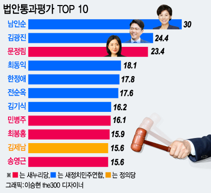 머니투데이 the300이 의제와전략 그룹 더모아와 함께 진행한 비례대표 평가 결과 19대 국회 비례대표 중 최고의 법안실적을 낸 국회의원은 새정치민주연합의 남인순 의원으로 집계됐다. 남 의원은 법안 발의와 통과 모두 만점을 받았다. 같은 당의 김광진 의원의 경우 각 부문에서 남 의원의 뒤를 이어 2위에 올랐다.