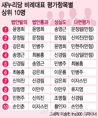 ◇법안 발의, 통과 윤명희, 문정림 두각 =법안발의 점수는 기능성 쌀 생산업체인 한국라이스텍 대표 출신인 윤명희 의원이 30점 만점에 21.9점을 기록해 1위를 차지했다. 새누리 비례대표 평가대상 27명 중 윤 의원만 20점대를 기록했고 나머지는 10점대였다. 그 뒤로는 문정림·강은희·송영근·신경림·최봉홍·신의진·양창영·민현주·손인춘 순으로 법안발의 점수가 높았다. 법안발의평가는 '법정형 정비와 단순 자구수정 등 의미없는 법안은 평가에서 처음부터 제외했고 비례대표의 '전문분야'에 가점을 주는 방식으로 계산됐다.