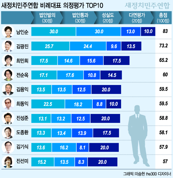 새정치민주연합 비례대표 의원들 가운데 입법 활동에서 두각을 나타낸 남인순 의원이 의정활동 종합평가 1위를 차지했다. 성실성 평가에선 백군기 의원, 다면평가에선 김용익·진성준·김기식·진선미 의원이 두각을 보였다.