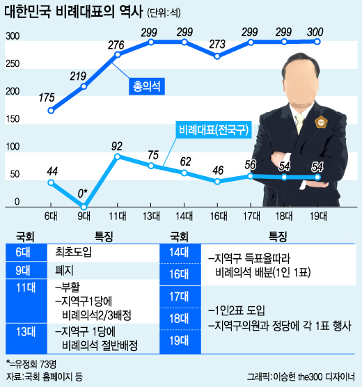 19세기 후반 벨기에에서 처음 고안돼 스위스에서 최초 시행된 비례대표제는 우리나라에 1963년 도입됐다. 1961년 5.16 이후 실시된 제6대 총선이다. 정당의 지역구 득표율을 배분 기준으로 삼고 전체의석의 1/4을 비례대표로 채웠다.