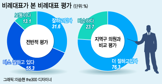 머니투데이 더300(the300)과 의제와전략그룹 더모아가 지난 9월부터 공동으로 진행한 비례대표 의원 대상 설문에서 38명의 비례 의원 응답자 중 76.3%(29명)가 지역구 의원보다 의정활동을 '잘하고 있다'고 답했다. '비슷하다'고 답한 의원은 9명(23.7%), '못하고 있다'고 적은 비례 의원은 없었다.