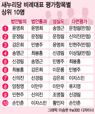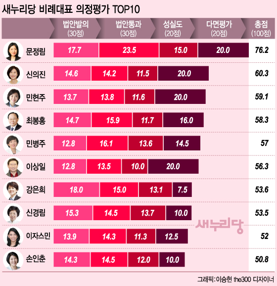 그 뒤로는 문정림·강은희·송영근·신경림·최봉홍·신의진·양창영·민현주·손인춘 순으로 법안발의 점수가 높았다. 법안발의평가는 법정형 정비와 단순 자구수정 등 의미없는 법안은 평가에서 처음부터 제외했고 비례대표의 '전문분야'에 가점을 주는 방식으로 계산됐다.