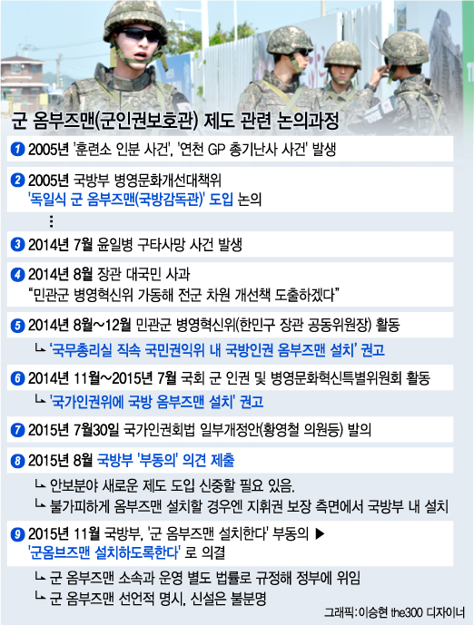 군 밖에서 군을 감시하는 '군 옴부즈맨(군인권보호관)' 제도의 도입은 2005년부터 본격적으로 논의됐다. 군 내 대형 사고가 터질 때마다 각종 위원회가 구성돼 군 옴부즈맨 및 군 인권법 제정을 촉구하다 무력화되는 일이 10년간 반복돼왔다.