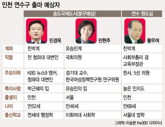 연수구 신도심은 '인천의 강남'으로 불리는 지역으로, 송도경제자유구역을 중심으로 보수성향의 중산층이 자리를 잡고 있다. 여당성향이 강한 이곳에는 유승민 의원의 최측근인 민현주 현 비례대표 의원(46)이 일찌감치 도전장을 냈다. 이에 맞서 친박(친박근혜)계에선 민경욱 전 청와대 대변인(52)이 나서 혈투가 예고된다.