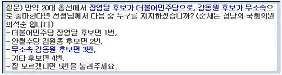 #.지난 20일 전북 순창에 사는 더불어민주당원 박모씨(68)는 황당한 여론조사 전화를 받았다. 자신이 지지하는 강동원 의원이 '무소속'으로 소개됐기 때문이다. 대신 다른 지역에서 4선을 지낸 장영달 전 의원이 더민주 소속으로 가장 먼저 소개됐다.