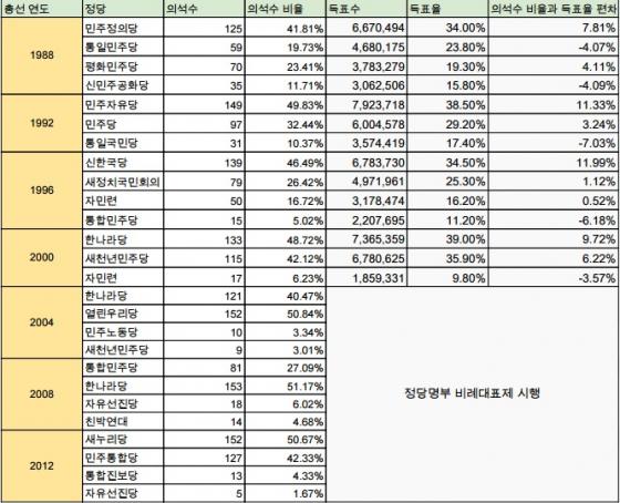 지역 구도가 소선거구제에서 부리는 마술이다. 평민당이 호남 지역 의석수를 싹쓸이하고 서울 지역에서 호남 출신이 다수인 지역을 가져온 결과다. 민주당은 부산에선 절대적인 강세를 보였지만 나머지 영남 지역에선 민정당에 밀렸고 서울에서도 우위를 점하지 못했다. 지역적으로 고른 득표율을 기록해도 한 표만 적게 받아면 의석을 잃는 소선거구제의 피해자가 됐다.