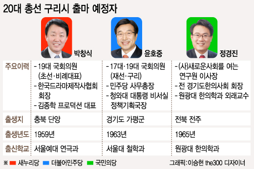 4.13 총선을 앞두고 당내 경선이 한창인 다른 지역과 달리 경기도 구리시는 이미 대진표가 완성 단계에 접어들었다. 후보자는 단 3명. 옆동네 남양주시에 2일 현재 무려 23명의 후보자가 몰린 것과 극명하게 대비된다.