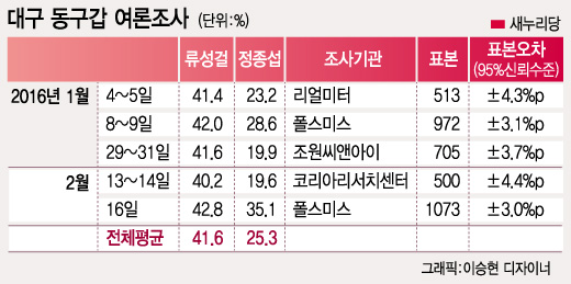 정종섭 전 행정자치부 장관이 예비후보로 등록한 대구 동구갑은 다섯번의 여론조사가 있었다. 현역의원인 류성걸 의원은 평균 41.6%의 지지를 받았고 정 전 장관은 평균 25.3%의 지지를 받았다.