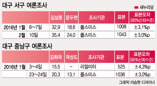 김상훈 새누리당 의원의 지역구인 대구 서구에는 두번의 여론조사가 있었다. 김 의원은 각각 32.9%와 35.4%의 지지를 받았고 윤 전 홍보수석은 18.6%와 24%의 지지를 받았다.