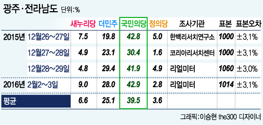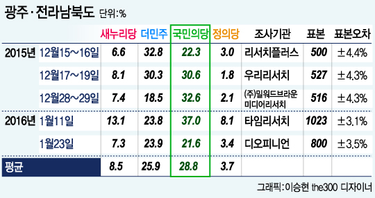 29일 중앙선거여론조사공정심의위원회에 등록된 12건의 광주, 전라남북도 지역의 여론조사 결과를 분석한 결과 광주만을 대상으로 3차례의 조사에서 국민의당은 평균 45.3%의 지지율을 얻은 것으로 나타났다. 더불어민주당은 국민의당보다 15.7%p(포인트) 적은 29.6%의 지지를 받는 것으로 나타났다. 새누리당은 7.5%, 정의당은 3.2%였다.