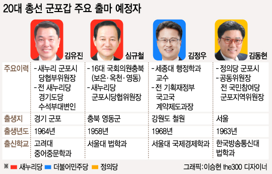 새누리당에서는 심규철 군포시 당협위원장과 김유진 군포시 부당협위원장이 나선다. 심 위원장의 경우 고향인 충북 보은·옥천·영동에서 16대 국회의원을 지냈으며 2년 전 군포당협위원장을 맡아 표밭을 다지고 있다.