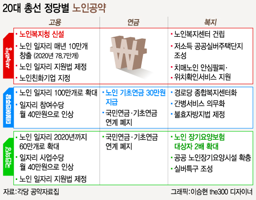 여야를 가리지 않고 노인 일자리를 4년 안에 현재보다 2~3배 늘리겠다는 데 초점을 맞췄다. 고령사회에 진입하면서 떠오른 노인층의 경제력 문제가 총선 이슈로 떠오른 셈이다.