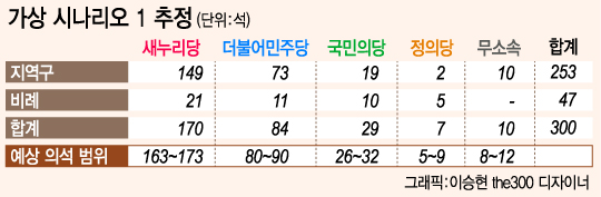 이런 시각에서 추정하면, 총 300석의 의석 분포는 다음과 같이 추정할 수 있다. 상황에 따른 승률변화와 의석수 추정치 변화 폭을 보여주기 위한 것으로 실제 각당의 우세지역 분류 수와 일치하지 않는 가상의 예를 든 것이다.