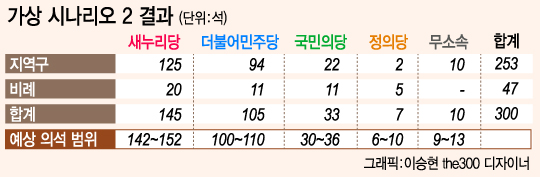 시나리오 1의 시각에서는 수도권에서만 새누리당과 더민주가 경합하는 지역이 60여개에 달할 경우, 과거 야권이 우세했던 지역에서도 국민의당이나 정의당 후보가 출마해 10% 정도의 득표를 할 것으로 예상되는 지역은 새누리당으로 판세를 바꿔 예측하게 된다. 구도 변수의 효과를 크게 잡기 때문이다.