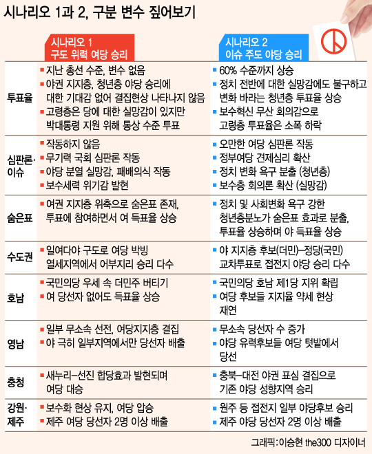 선거전이 본격화되면서 나타난 새누리당 지지율 하락세, 야권에 대한 기대감 상승, 변화를 기대하는 유권자들의 자발성이 투표 당일 현실로 표출될 것으로 가정한 것이 시나리오 2의 분석 관점이다.