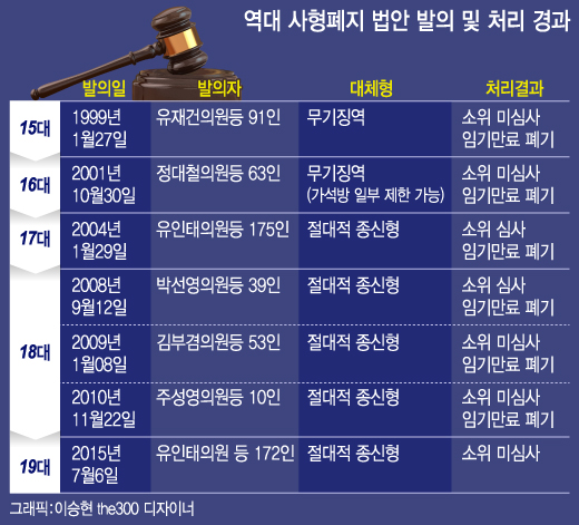 ◇15대 때 첫 발의, 5차례 발의-폐기 반복=우리나라의 사형제도 폐지 법안은 15대 국회 때인 1999년 유재건 의원 등 91명이 처음 발의했다. 이후 16대 때는 정대철 의원 등 63명이, 17대 때는 유인태 의원 등 175명이 서명한 법안이 발의됐다. 18대에는 박선영 의원 등 39인, 김부겸 의원 등 53인, 주성영 의원 등 10인이 각각 서명한 3건의 폐지 법안이 나왔고, 19대 때는 유인태 의원이 자신의 두번째 사형제도 폐지 법안을 대표발의했다. 이들 법안들은 모두 소관 상임위 문턱도 넘지 못하고 국회 임기 만료로 폐기됐다. 그나마도 상임위 법안소위에서 논의가 이뤄진 것은 지난 17대와 18대 두 차례 뿐이다. 19대 국회에서는 소관 상임위인 법제사법위원회 차원에서 지난해 11월 공청회를 개최했지만 역시 후속 논의가 이어지지 못했다.