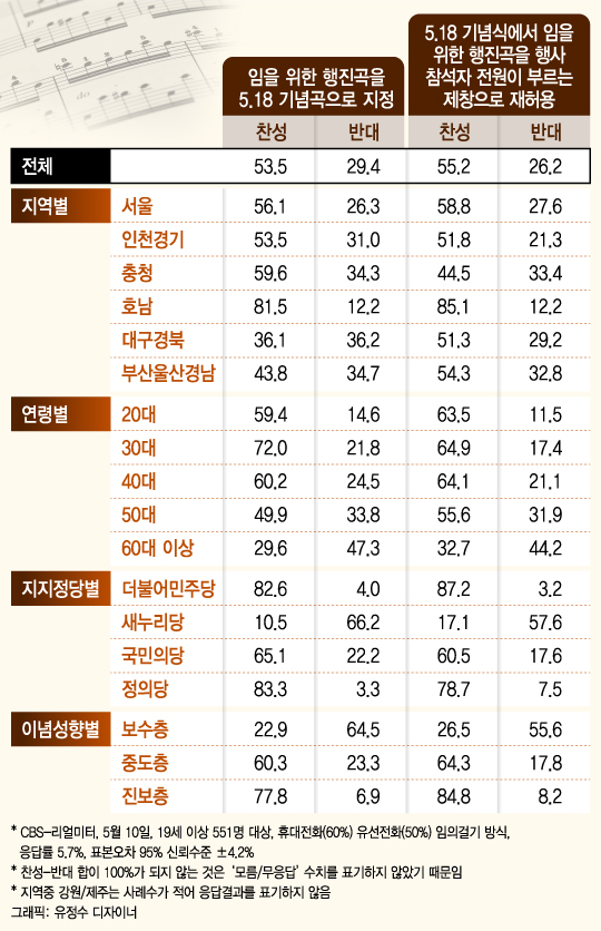 새누리당이 총선에서 대패한 서울과 수도권, 40대와 50대, 중도층 유권자들의 다수는 임을 위한 행진곡을 기념식에서 제창하도록 하거나 아예 기념곡으로 지정하는 데 찬성하는 입장을 보이고 있다.