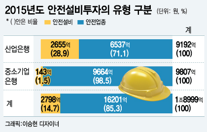 이에 따라 지난해 안전업종 지원 수요가 급증했다. 특히 중소기업을 주된 지원대상으로 하는 중소기업은행의 경우 지원액의 98.5%가 일반기업의 안전설비투자가 아니라 안전업종 기업의 일반 설비투자 용도로 이뤄졌다. 한쪽 목표에 지나치게 편중돼 안전설비투자 펀드가 공급되고 있다는 지적이다.