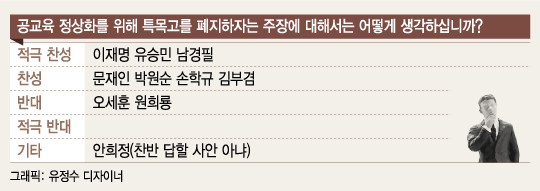 ◇특목고 폐지에 '무게'…최소한만 존치=공교육 정상화를 위한 특목고 폐지 의견에 대해선 찬성에 무게가 실렸다. 이 시장, 유 의원, 남 지사는 '적극 찬성', 문 전 대표, 박 시장, 손 전 대표, 김 의원은 '찬성' 의견을 제시했다. 오 전 시장, 원 지사는 '반대' 답변을 제출했다. 안 지사는 "찬반을 답할 사안이 아니다"며 유보적 입장을 피력했다.