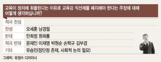 ◇교육감 직선제 폐지 '반대' 다수='교육이 정치에 휘둘린다'는 비판에 따라 제기된 교육감 직선제 폐지 의견에는 반대 의견이 많았다. 정부와 시·도교육청의 누리과정 예산을 둘러싼 갈등을 반영한 결과로 풀이된다.