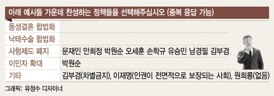 ◇'역풍 맞을라' 동성결혼·낙태수술 합법화 찬성 없어=소수자 보호, 인권 신장, 다양성 확대 등에 대한 의견에는 대선후보 모두 신중한 입장을 보였다. '동성결혼'과 '낙태수술'의 합법화에 찬성하는 후보는 한명도 없었다. 대선 국면에서 이같은 내용이 이슈화될 경우 종교단체 등의 거센 반발을 우려한 것으로 풀이된다.