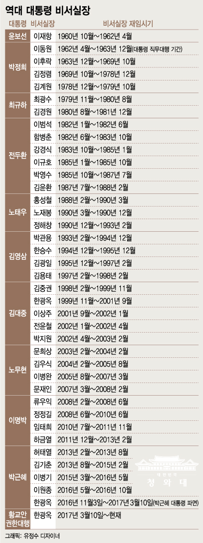 대통령비서실장의 역사는 60년 가까이 된다. 최고 실세 권력을 누린 이가 적잖다. ‘왕실장’으로 불린 이들이다. "호가호위한다"는 비판을 받기도 했다. 반대로 존재감 없이 역사 속으로 사라진 인물들도 있다.