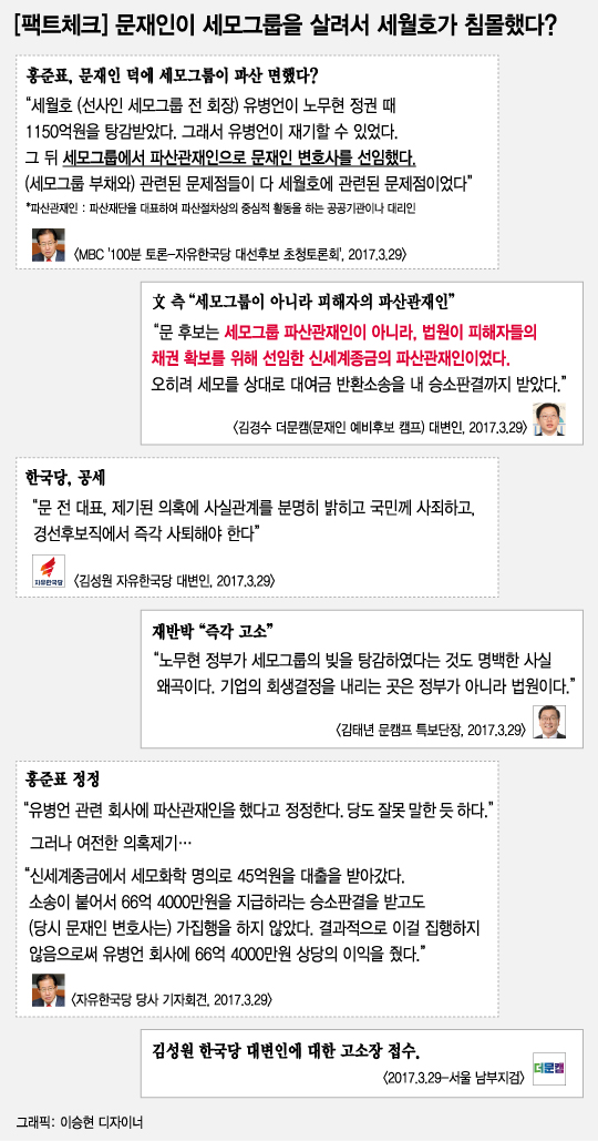 홍 후보는 29일 새벽 MBC에서 진행된 '자유한국당 대선후보 초청토론회'에 출연해 "세월호 (선사인 세모그룹 전 회장) 유병언이 노무현 정권 때 1150억원을 탕감받았다. 그래서 유병언이 재기할 수 있었다"며 "그 뒤 세모그룹에서 파산관재인으로 문재인 변호사를 선임했다. (세모그룹 부채와) 관련된 문제점들이 다 세월호에 관련된 문제점이었다"고 사실상 세월호 침몰의 원인이 문 후보에게 있다고 지적했다.