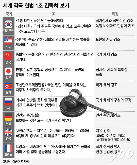[the300][내삶을 바꾸는 개헌 3-上]②나라마다 최우선 가치 '헌법 1조'에 담아